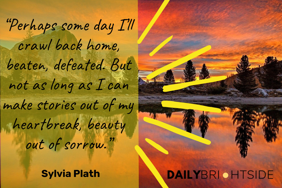 34. “Perhaps some day I’ll crawl back home, beaten, defeated. But not as long as I can make stories out of my heartbreak, beauty out of sorrow.” Sylvia Plath